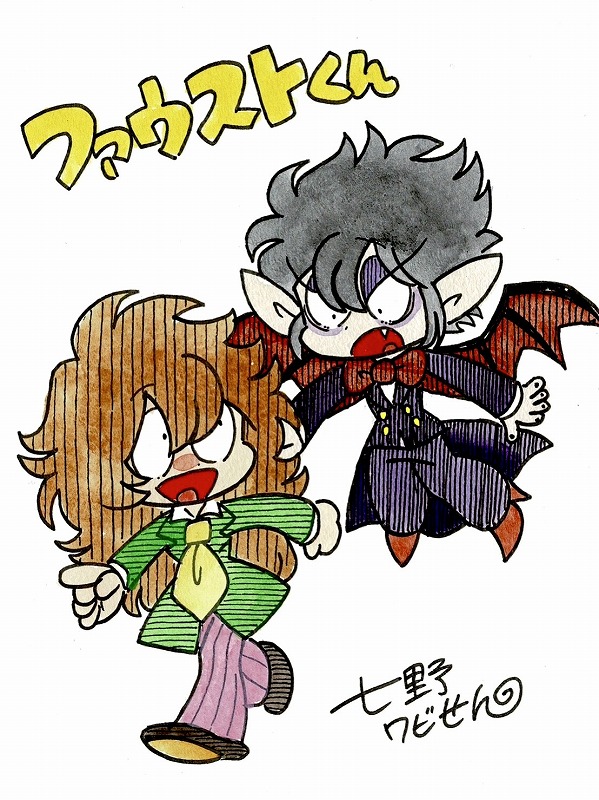 ![]() ★ファウスト★ 悪魔メフィストを召喚して、自身の魂と引き換えに、一年間何でも願いを叶えてもらう契約を交わす。 悪魔の力で若返ったもと90歳の男。 願い事は平凡で平和な我儘が多い。本当の名前は斎藤文男(さいとうふみお)。 ![]() ★メフィストフェレス★ ファウスト(文男)に召喚された悪魔。 平凡な願いごとばかり叶えさせられる日々に、退屈したり、なんだかんだ馴染んだりしている。 過去に自分を召喚した男の事を全員ファウストと呼んでおり、文男のこともそう呼んでいる。 |